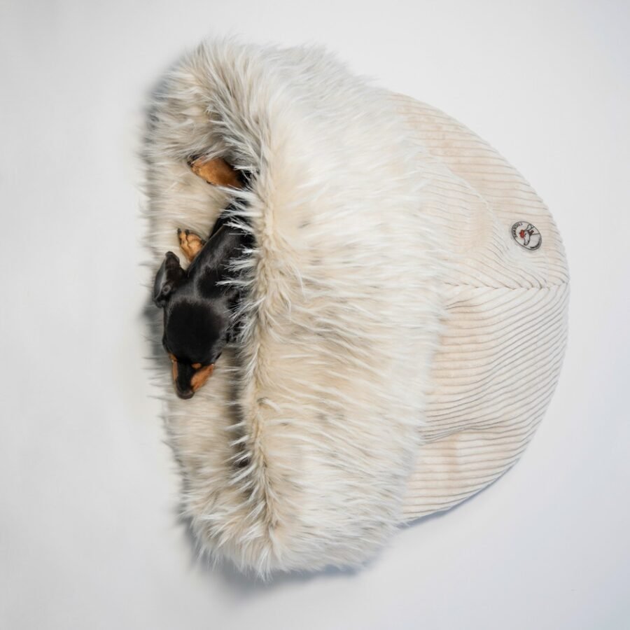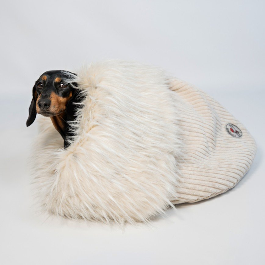 Our Cozy Cocoons are made from soft, high-quality faux fur and particularly sturdy fabrics. For every Cocoon purchased we offer a fabric toy bone in matching color as a gift.