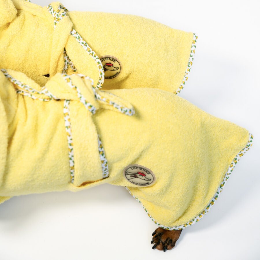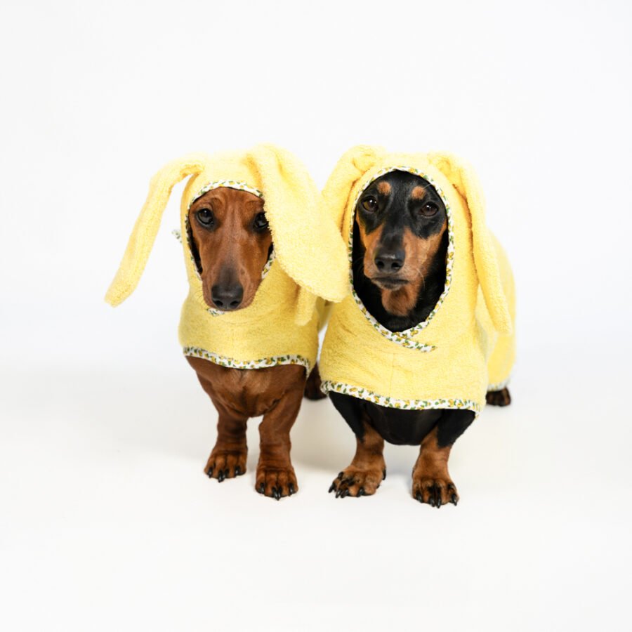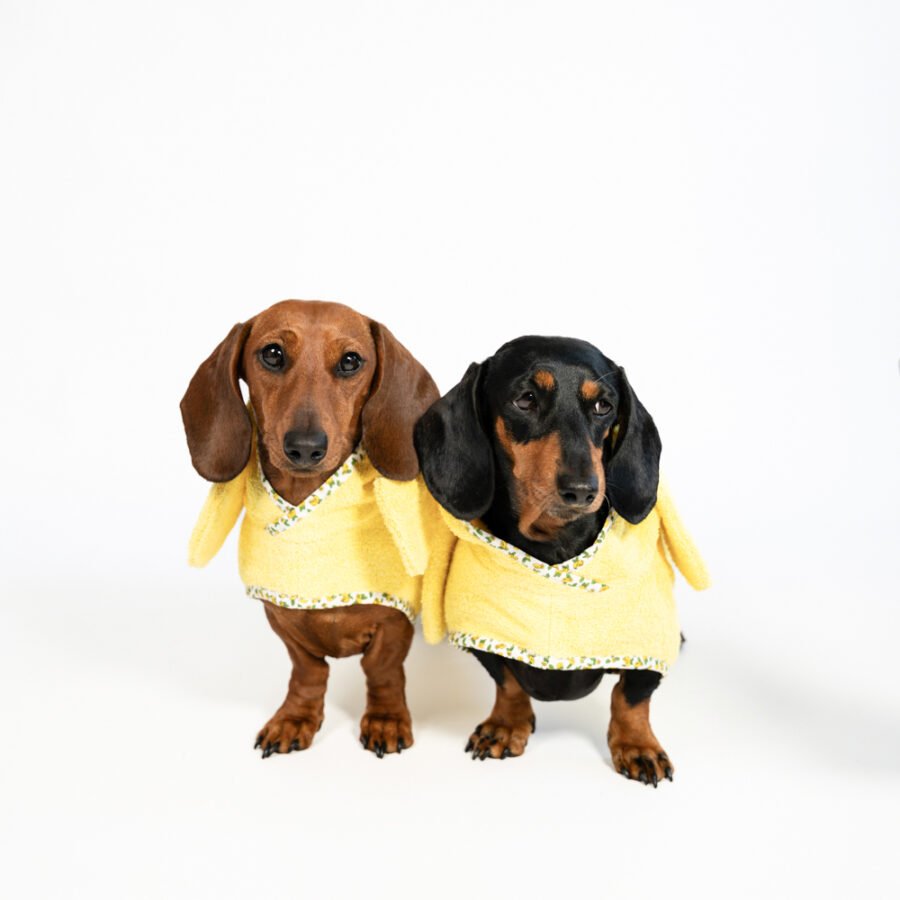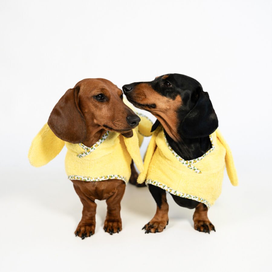Our new bathrobe in a summer color – yellow with lemon trim – will be perfect to accompany your dachshund on vacation!