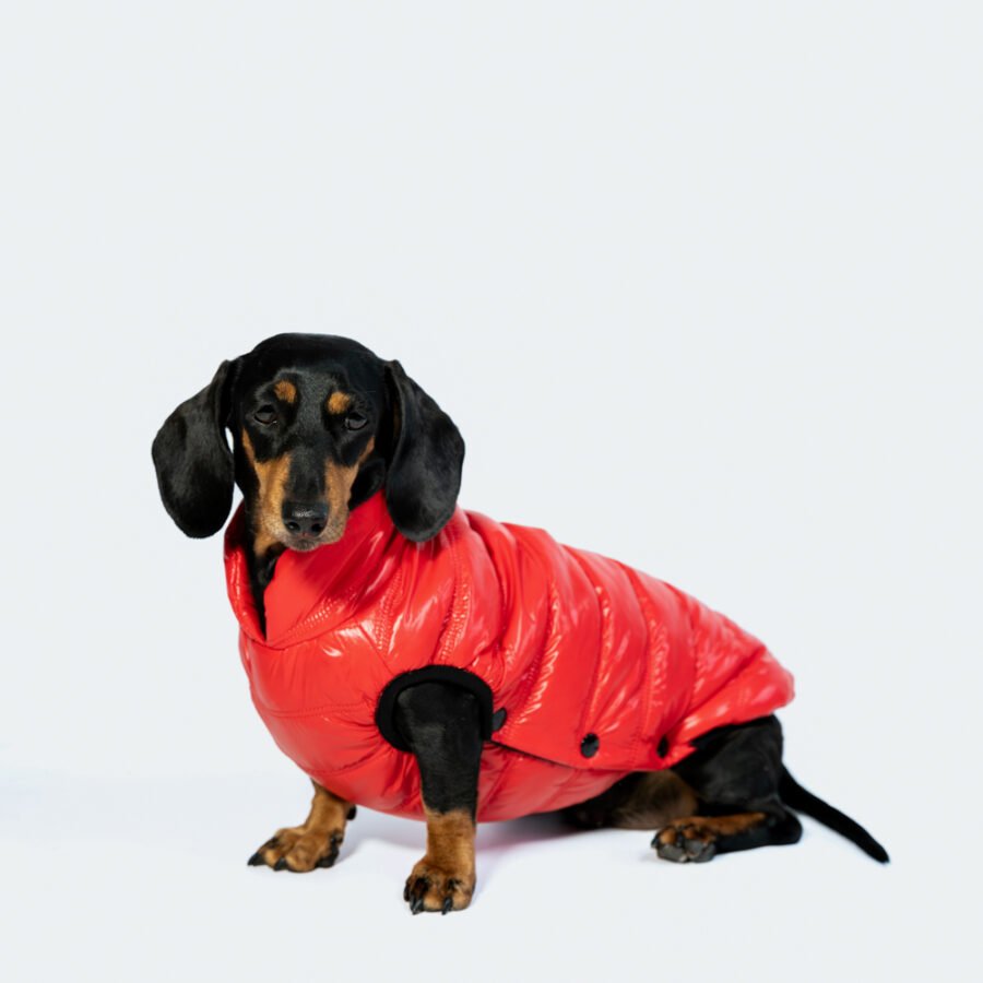 Ce manteau va protéger et chauffer votre teckel pendant le temps froid sec ou de pluie.