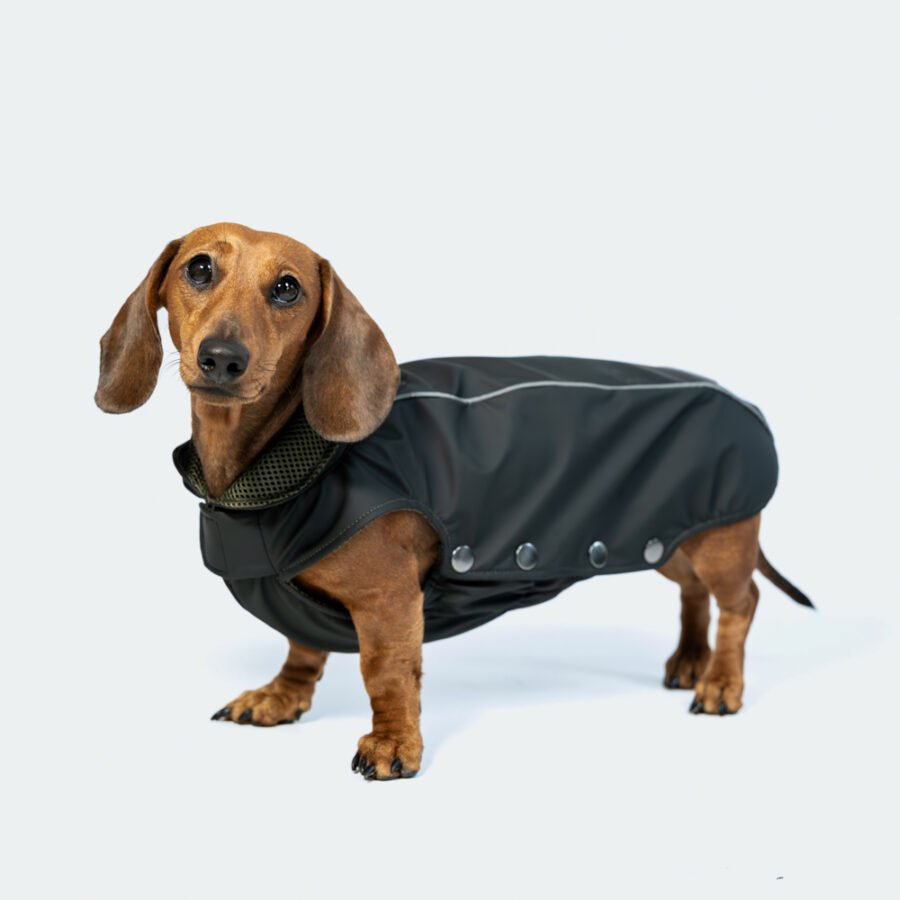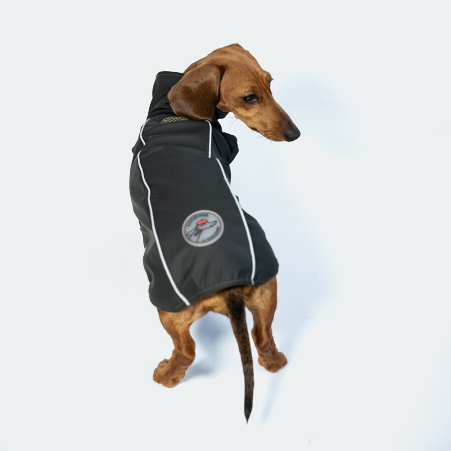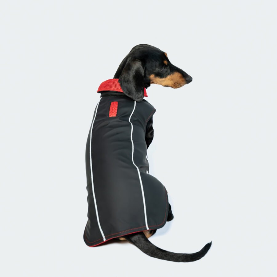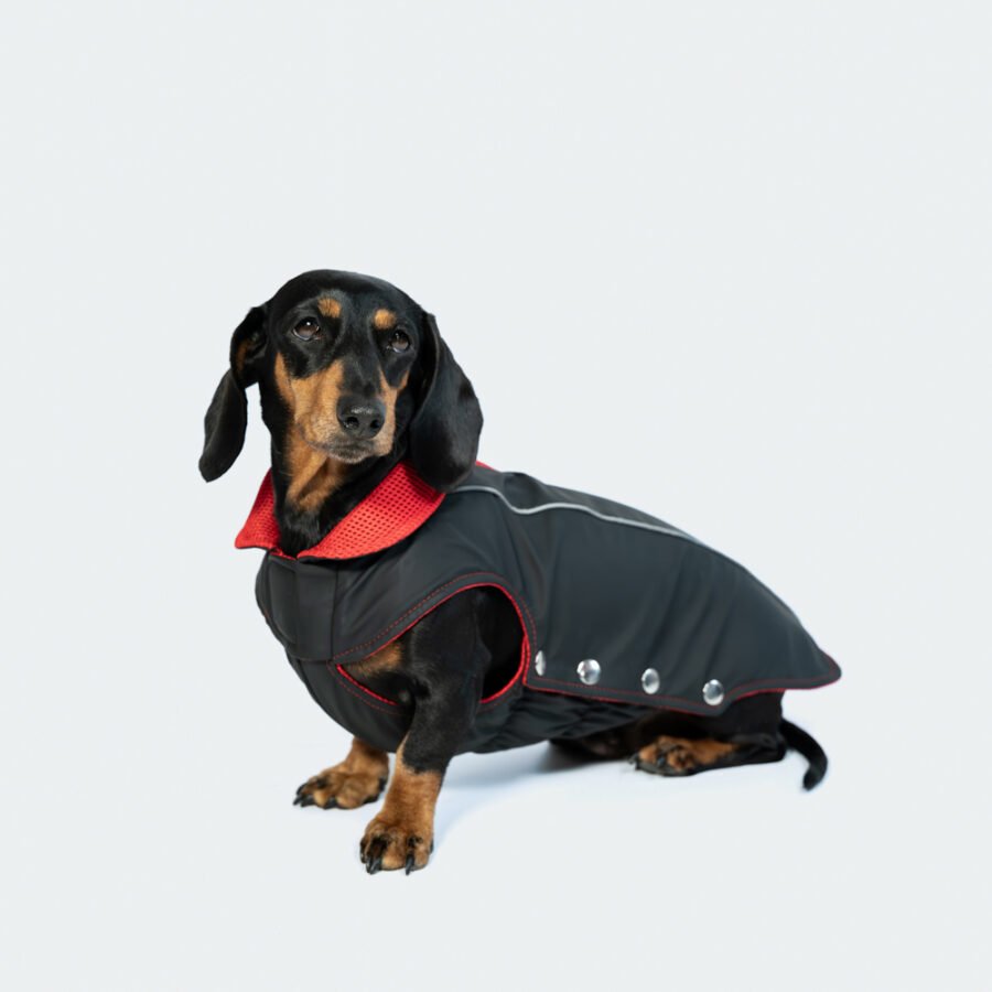 La fermeture est en boutons de pression. Il y a deux bandes réfléchissantes pour mieux voir votre teckel la nuit.